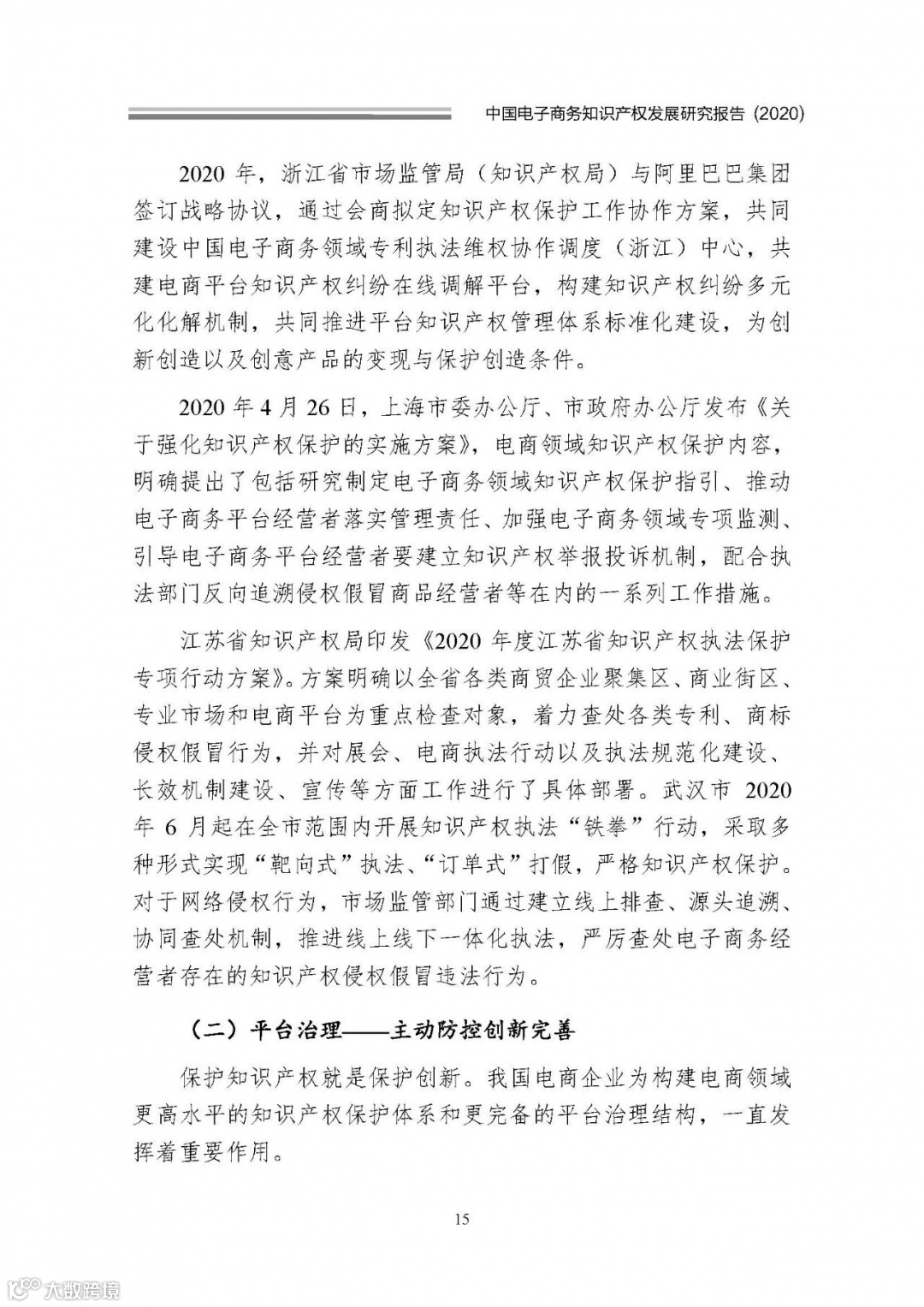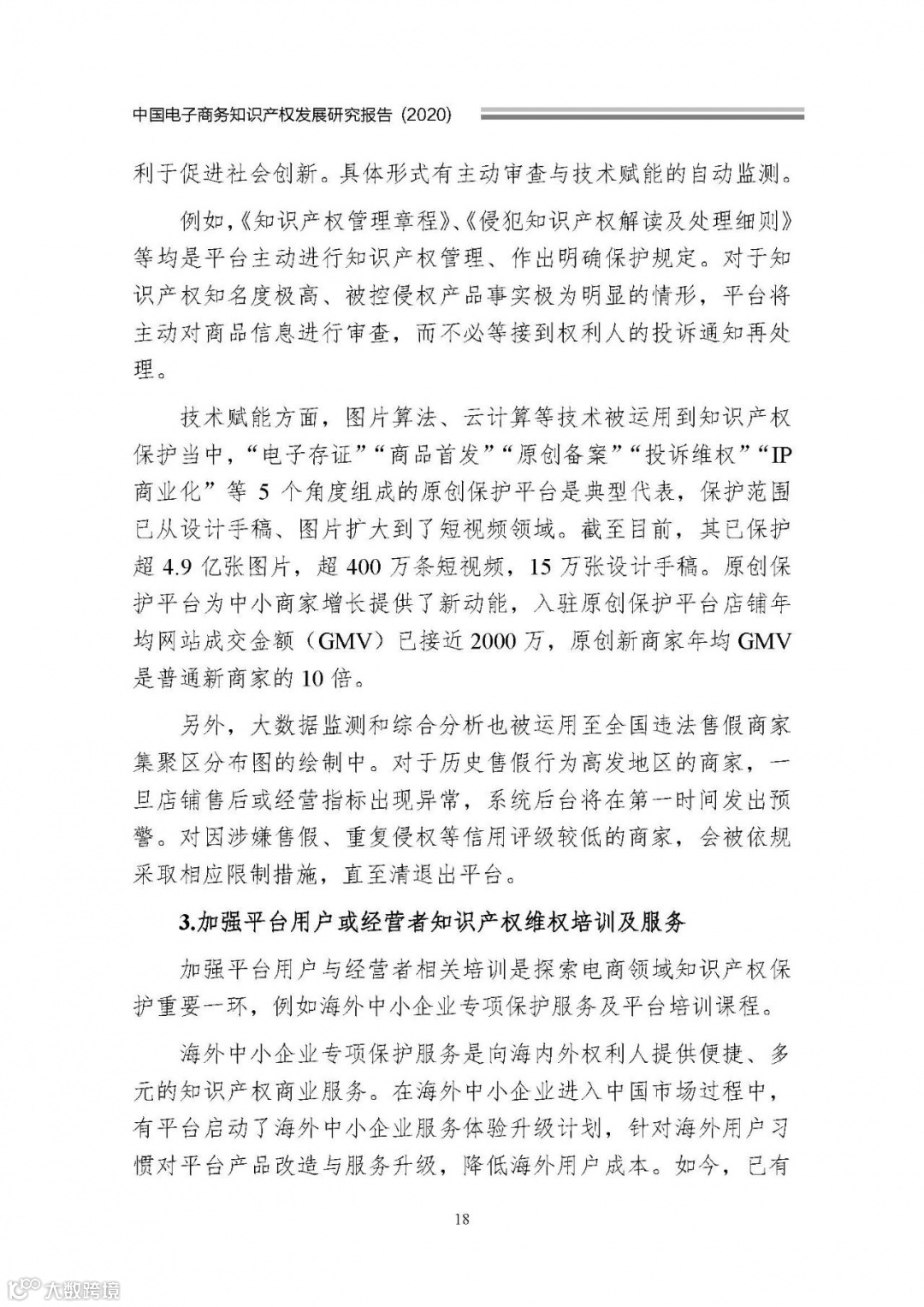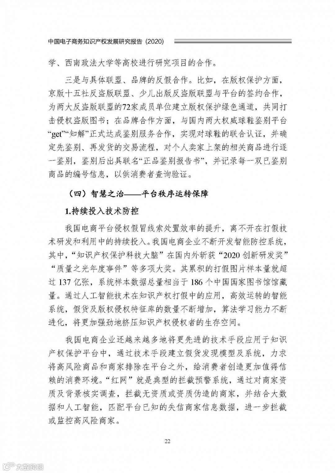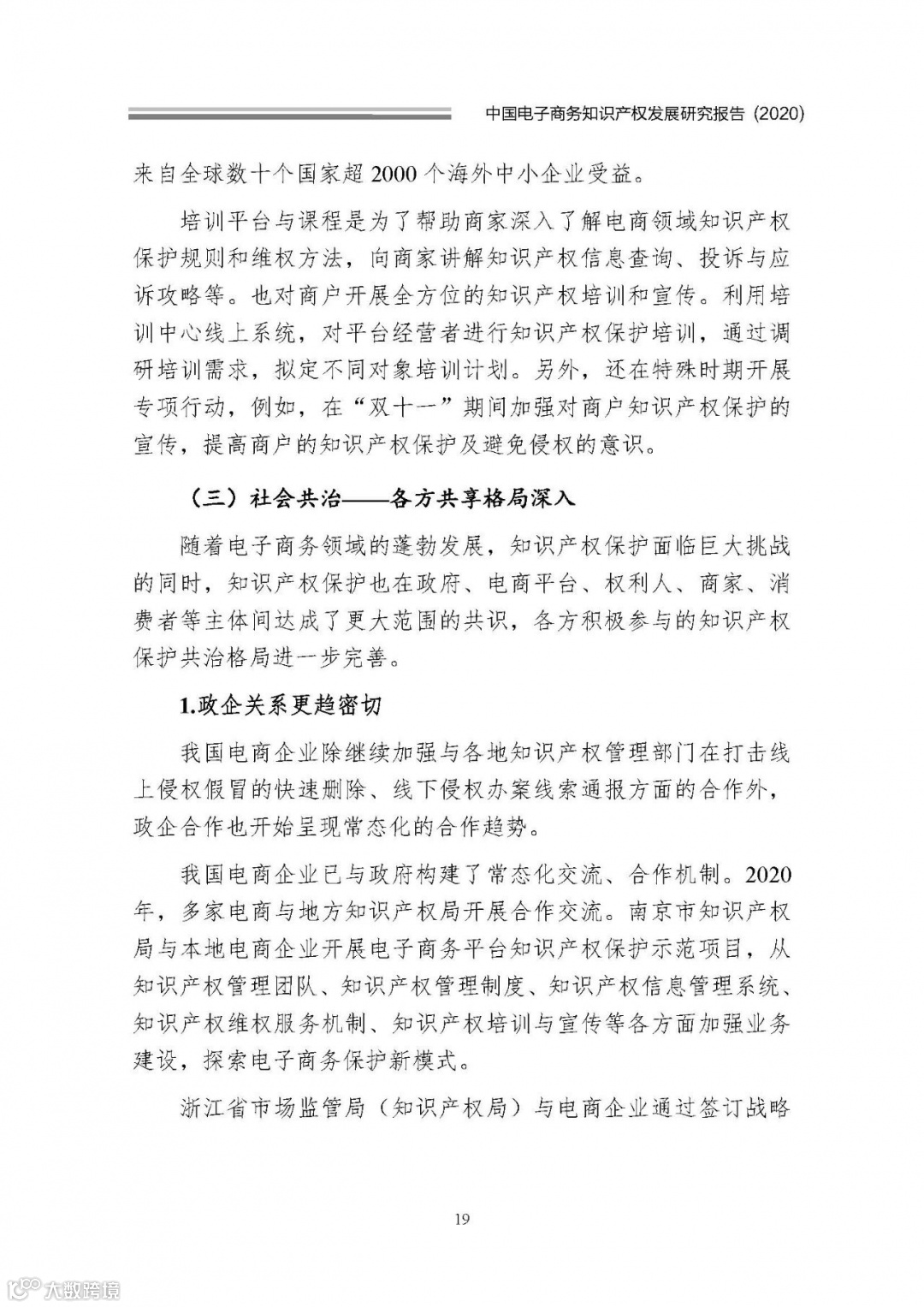 二是平台治理。2020年,各平台企业切实履行平台义务,细化平台内知识产权保护管理,各大电商平台知识产权权利人入驻数量不断提升。例如,阿里巴巴集团知识产权保护平台(简称IPP平台)设置更严格的商家入驻审核机制,从身份、资质两方面入手对商家进行审核,对依法需要取得相关许可的店铺和商品,采取“人工必审”制度,96%的知识产权投诉在24小时内被处理。