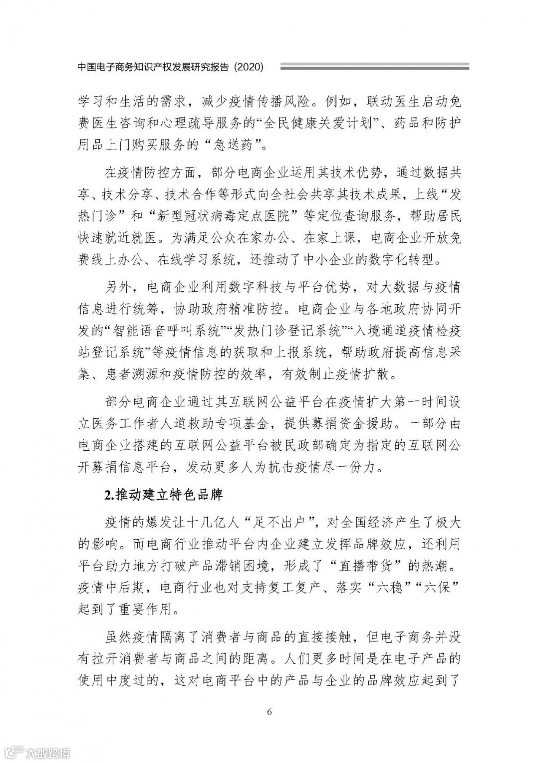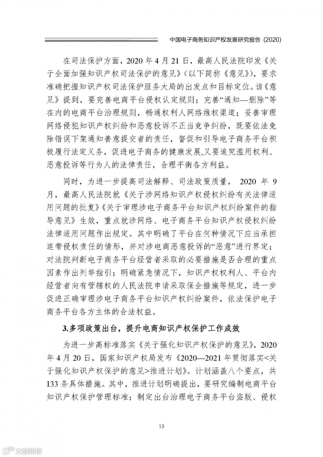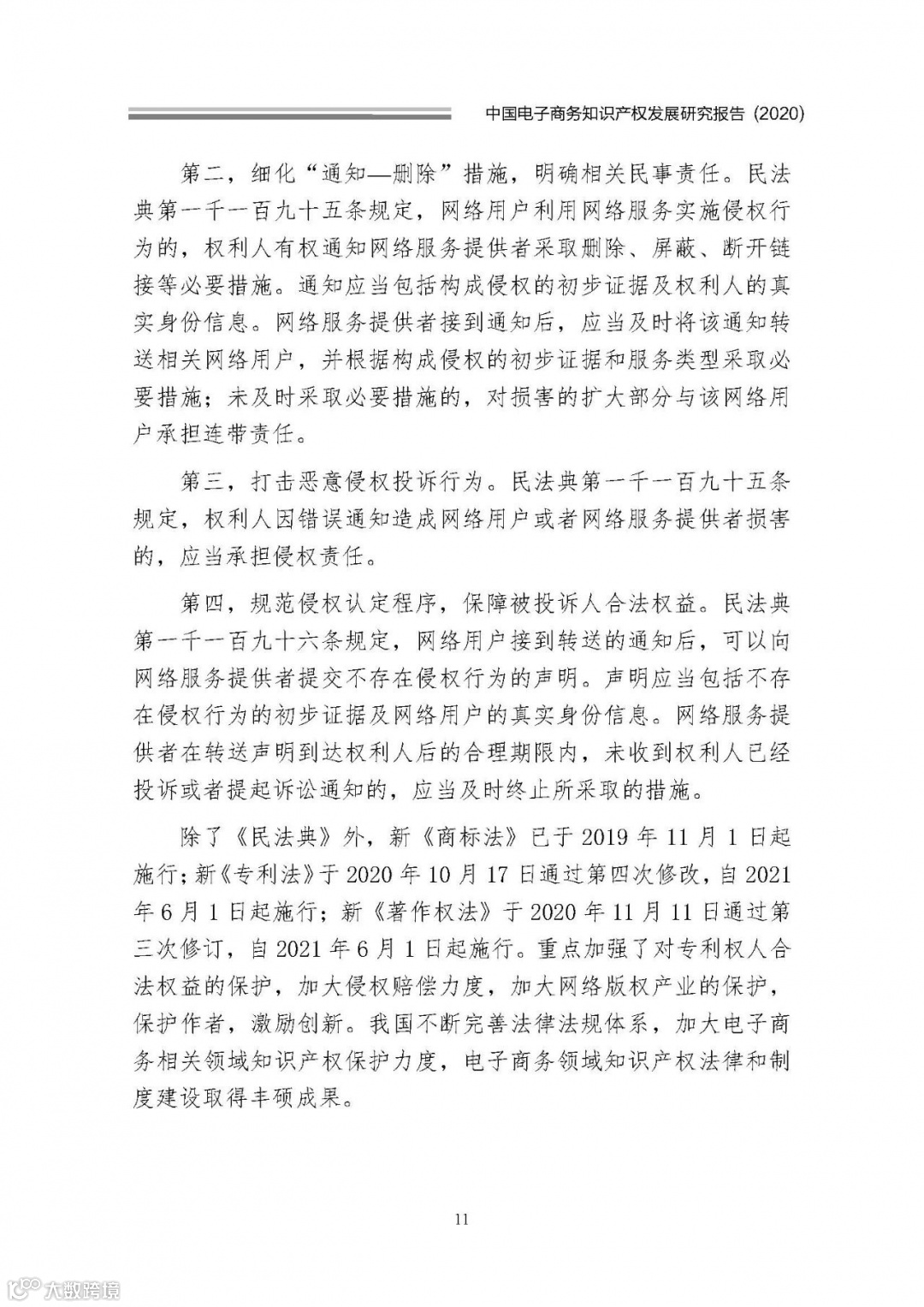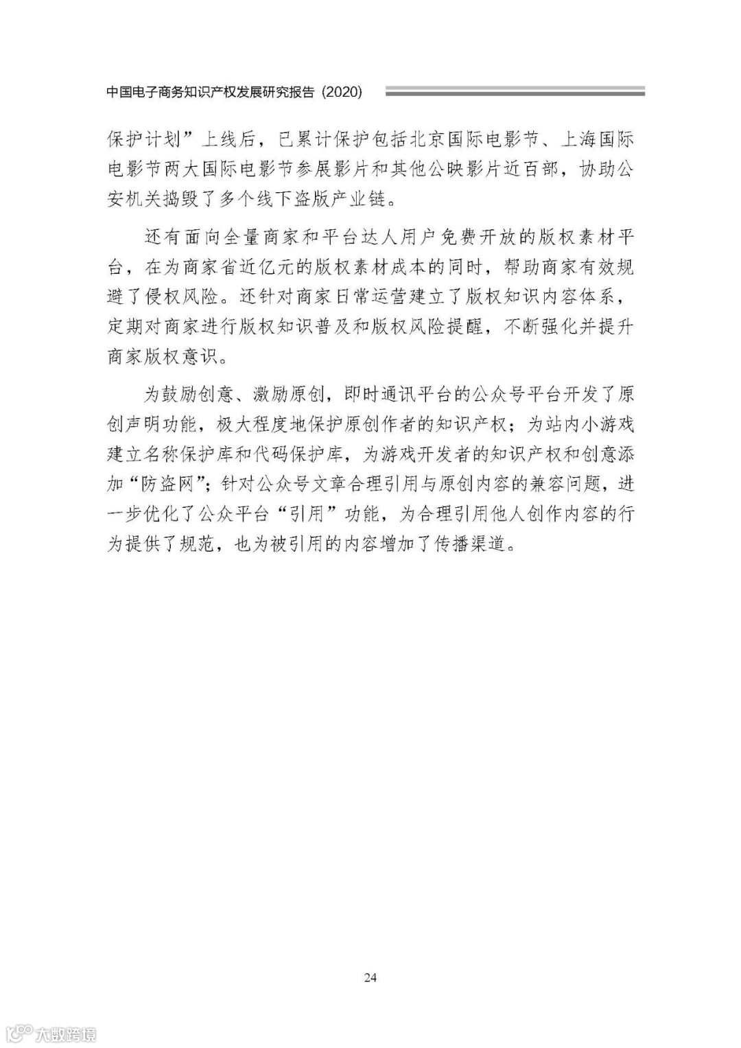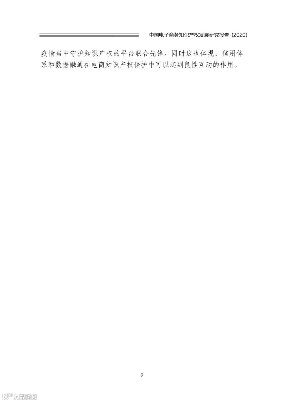 二是平台治理。2020年,各平台企业切实履行平台义务,细化平台内知识产权保护管理,各大电商平台知识产权权利人入驻数量不断提升。例如,阿里巴巴集团知识产权保护平台(简称IPP平台)设置更严格的商家入驻审核机制,从身份、资质两方面入手对商家进行审核,对依法需要取得相关许可的店铺和商品,采取“人工必审”制度,96%的知识产权投诉在24小时内被处理。
