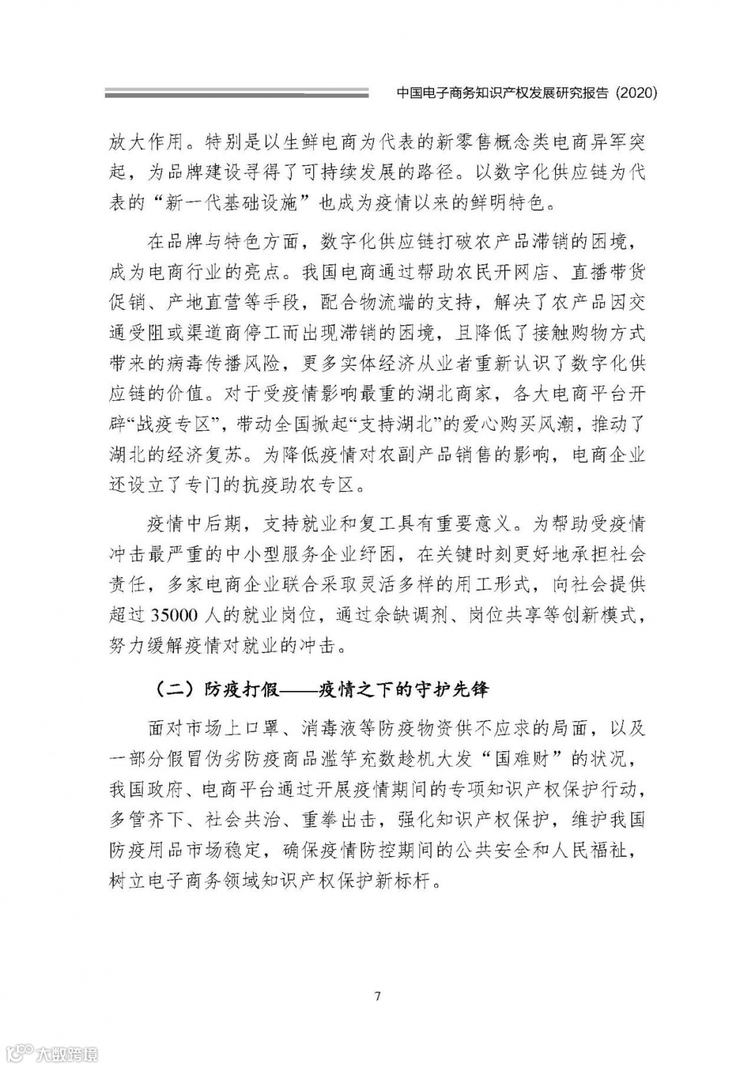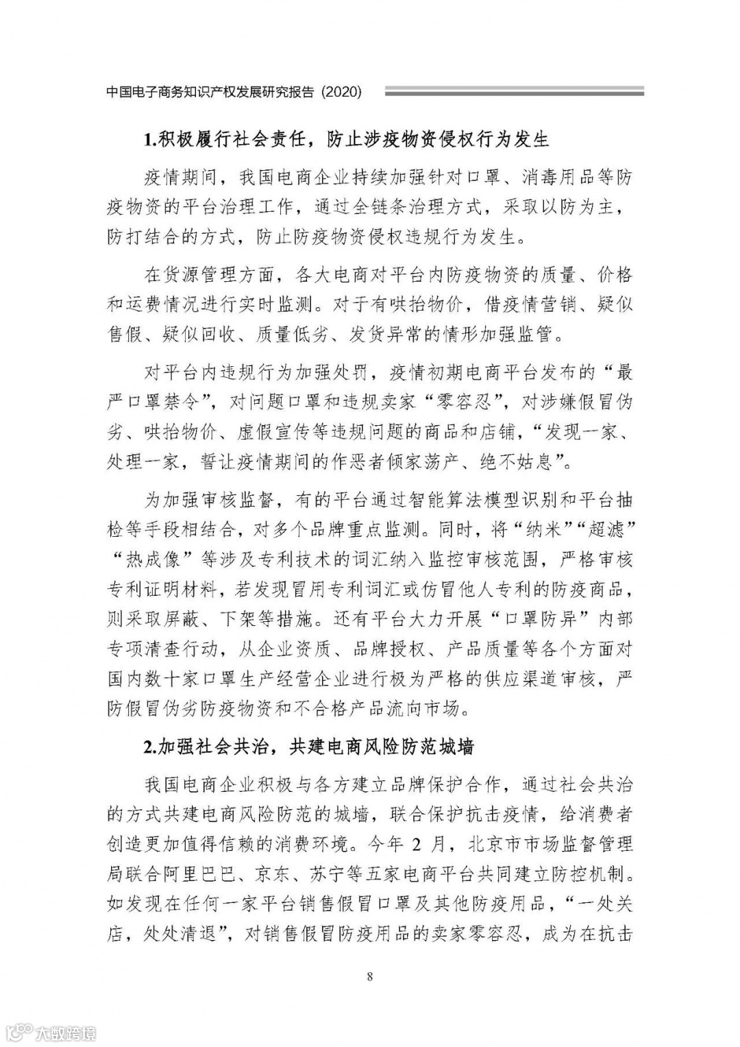 三是社会共治。政企、权利人、消费者等多元社会主体协同的社会共治在电子商务知识产权保护中发挥着愈加重要的作用。今年2月,阿里巴巴、京东、苏宁等五家电商平台共同建立防控机制。如发现在任何一家平台销售假冒口罩及其他防疫用品,“一处关店,处处清退”,对销售假冒防疫用品的卖家零容忍,成为全力抗击疫情、守护知识产权的平台联合先锋。