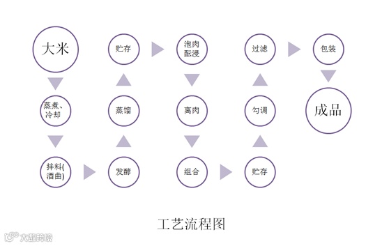 如下图所示,九江双蒸古法酿酒的工艺流程大致为,以大米为原料,辅以黄豆、酒饼叶和曲种制成酒曲, 加上纯净西江水, 采用续添蒸饭、再度发酵、冷却馏酒、斋酒贮存、陈肉酝浸、勾兑沉、过滤包装等方法精心酿造而成。