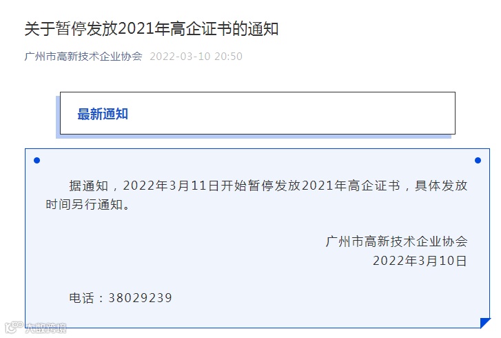 据通知,2022年3月11日开始暂停发放2021年高企证书,具体发放时间另行通知。联系电话:38029239。
