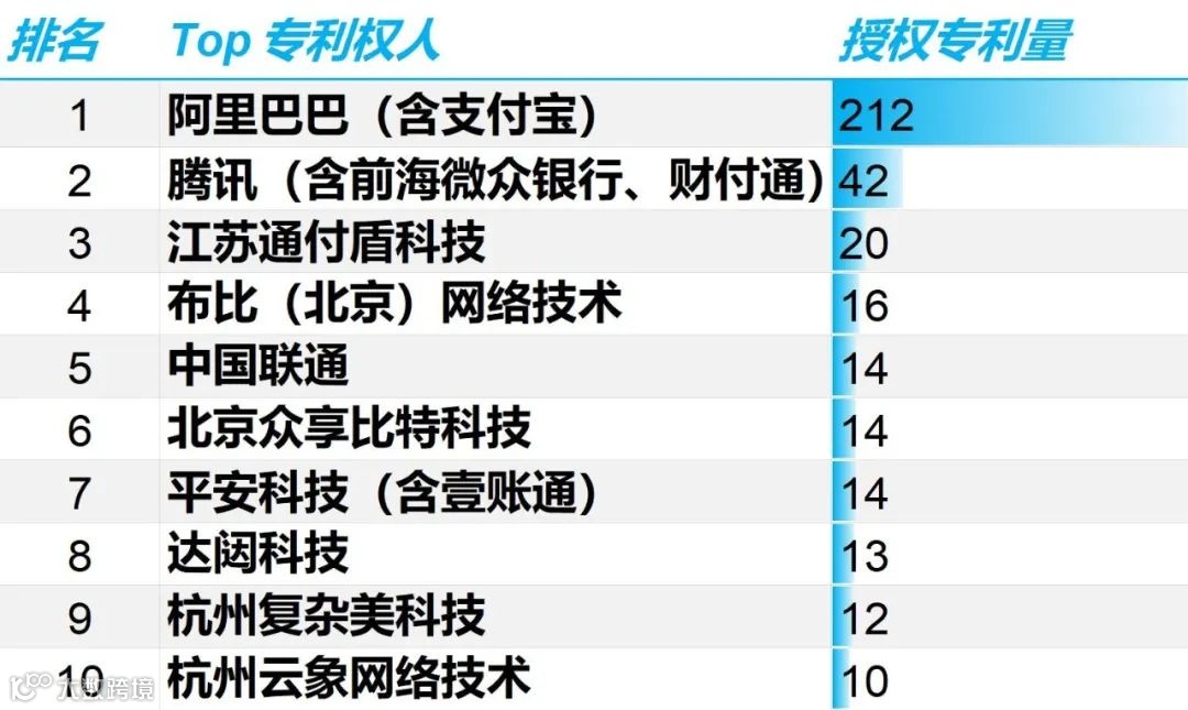 可以看出除了阿里巴巴(支付宝)和腾讯以外,还有一些大型企业例如中国联通、平安科技等在本领域有少量授权专利,也有一些中小型新创企业和高校在本领域布局。