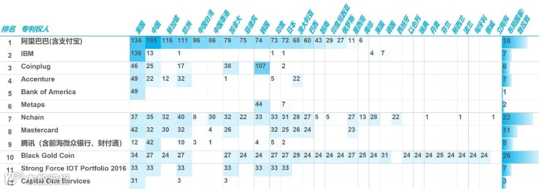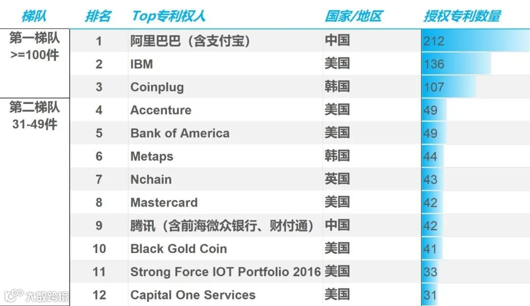 第一梯队和第二梯队的专利权人中,有2家中国企业——阿里巴巴(支付宝)和腾讯,2家韩国企业Coinplug和Metaps,1家英国企业Nchain,其余均为美国企业。