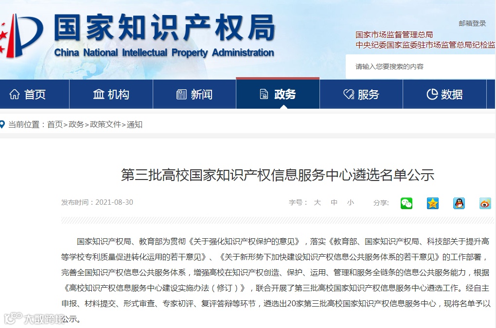 国家知识产权局、教育部为贯彻《关于强化知识产权保护的意见》,落实《教育部、国家知识产权局、科技部关于提升高等学校专利质量促进转化运用的若干意见》、《关于新形势下加快建设知识产权信息公共服务体系的若干意见》的工作部署,完善全国知识产权信息公共服务体系,增强高校在知识产权创造、保护、运用、管理和服务全链条的信息公共服务能力,根据《高校知识产权信息服务中心建设实施办法(修订)》,联合开展了第三批高校国家知识产权信息服务中心遴选工作。经自主申报、材料提交、形式审查、专家初评、复评答辩等环节,遴选出20家第三批高校国家知识产权信息服务中心,现将名单予以公示。