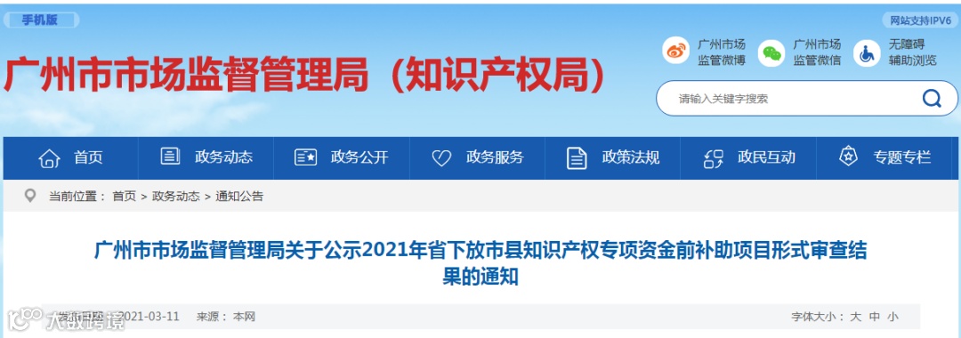 根据《广东省促进经济高质量发展专项资金(市场监督管理)管理办法》和《广州市市场监督管理局关于印发<2021年省下放市县知识产权专项资金项目申报指南>的通知》有关要求,我局对14项申报2021年省下放市县知识产权专项资金前补助项目进行了形式审查,现将形式审查结果予以公示(详见附件),公示时间为2021年3月10日—3月16日。公示期满后,我局将委托第三方机构组织专家对通过形式审查且经公示无异议的项目进行评审。