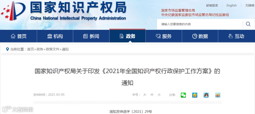 2021年是中国共产党成立100周年,也是“十四五”规划开局之年。为深入贯彻党中央、国务院关于全面加强知识产权保护的决策部署,落实全国知识产权局局长会议、全国知识产权保护工作会议有关要求,制定本工作方案。
