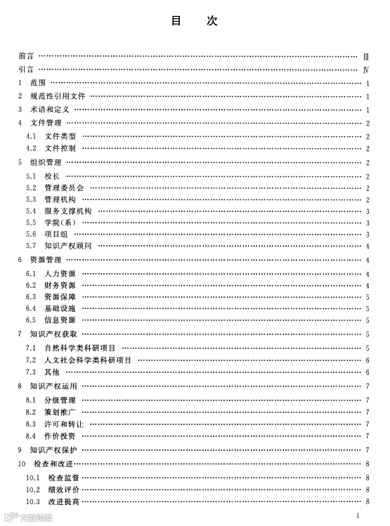 由上面的目录可以看出,《高等学校知识产权管理规范》(GB/T 33251-2016)共有10个章节,主要内容从第4章起至第10章。而这当中,第5、6、7、8、9章为高校知识产权贯标的重点内容。