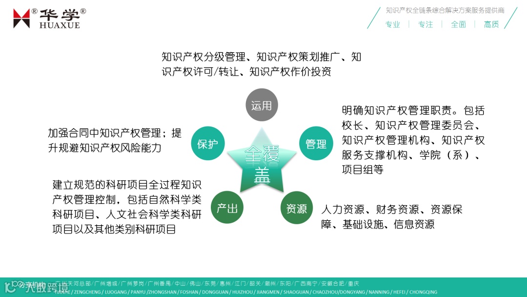 高校知识产权贯标涵盖的重点内容包括:明确参与人员和组织知识产权管理职责;规范知识产权资源管理;规范知识产权获取过程管理、知识产权基础管理;规范并强化高校的知识产权转化、运用;提升高校的知识产权保护能力。