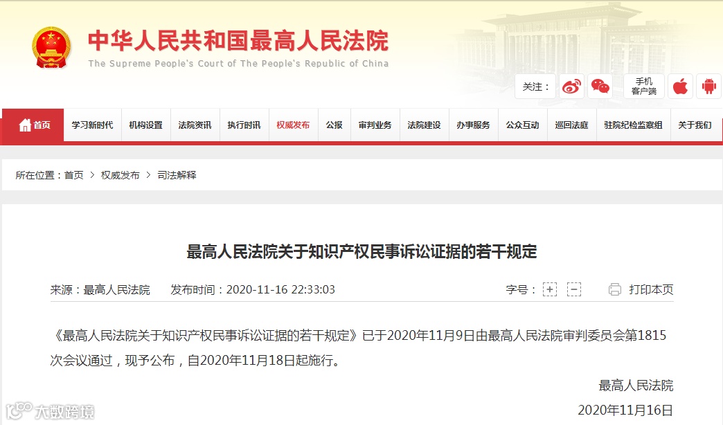 《最高人民法院关于知识产权民事诉讼证据的若干规定》已于2020年11月9日由最高人民法院审判委员会第1815次会议通过,现予公布,自2020年11月18日起施行。