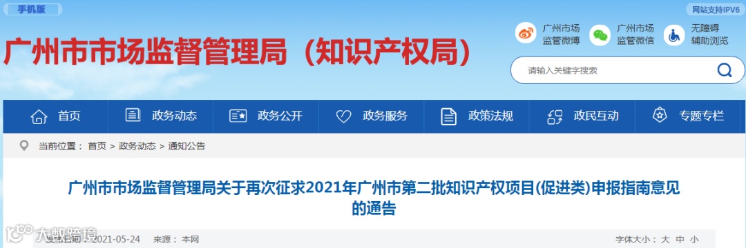 为做好2021年广州市第二批知识产权项目(促进类)申报工作,我局根据社会反馈意见对申报指南有关内容进行了修改,现再次向社会公开征求《2021年度广州市第二批知识产权项目(促进类)申报指南(第二次征求意见稿)》意见。征求意见反馈截止时间为2021年5月26日(星期三),具体途径如下: