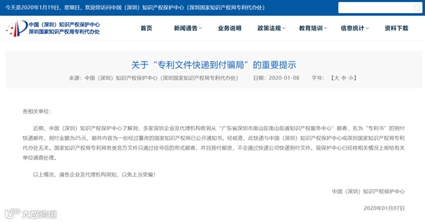 近期,中国(深圳)知识产权保护中心了解到,多家深圳企业及代理机构收到从“广东省深圳市南山区南山街道知识产权服务中心”邮寄,名为“专利书”的到付快递邮件,到付金额为25元,邮件内容为一份经过篡改的国家知识产权局已公开通知书。经核查,此快递与中国(深圳)知识产权保护中心或深圳国家知识产权局专利代办处无关。国家知识产权局专利局各类官方文件只通过挂号信的形式邮寄,并且预付邮资,不会通过快递公司快递到付文件。现保护中心已经将相关情况上报给有关单位调查处理。
