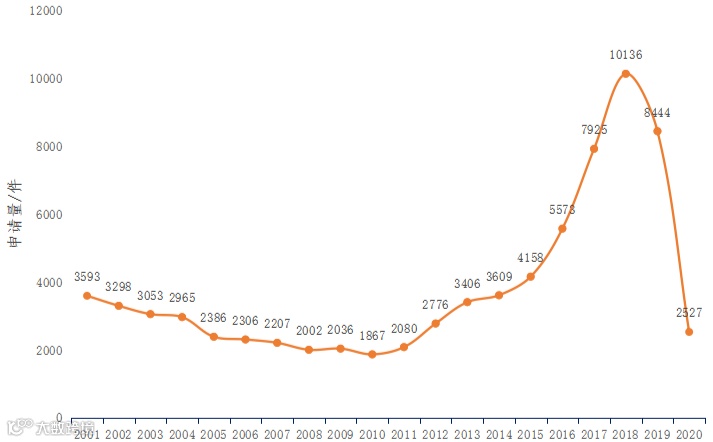图1全球近二十年专利申请趋势