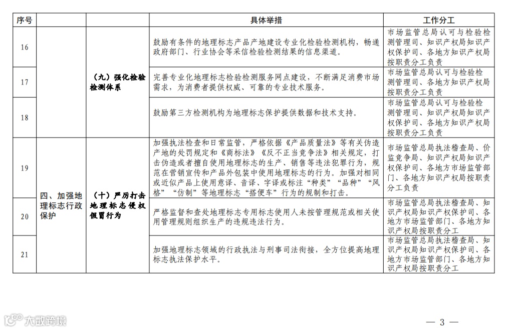 (九)强化检验检测体系。鼓励有条件的地理标志产品产地建设专业化检验检测机构,畅通政府部门、行业协会等采信检验检测结果的信息渠道。完善专业化地理标志检验检测服务网点建设,不断满足消费市场需求,为消费者提供权威、可靠的专业技术服务。鼓励第三方检测机构为地理标志保护提供数据和技术支持。