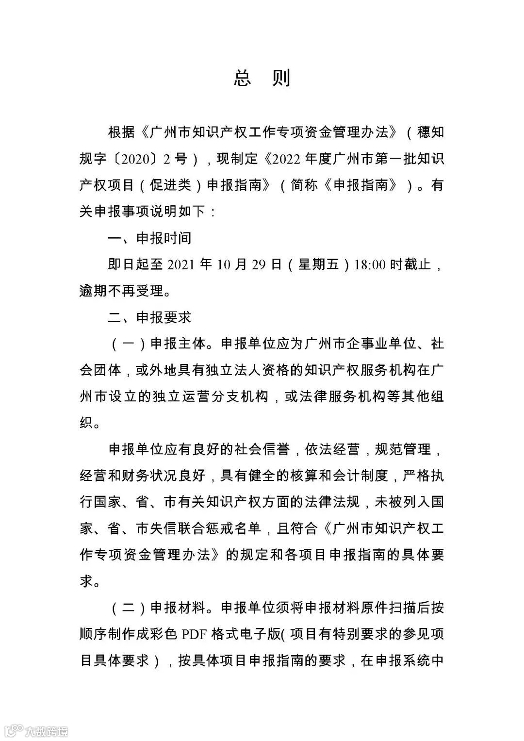为做好2022年度广州市知识产权项目申报工作,根据《广州市知识产权工作专项资金管理办法》(穗知规字〔2020〕2号)有关要求,我局制定了2022年度广州市第一批知识产权项目(促进类)申报指南。现印发给你们,并将有关事项通知如下: