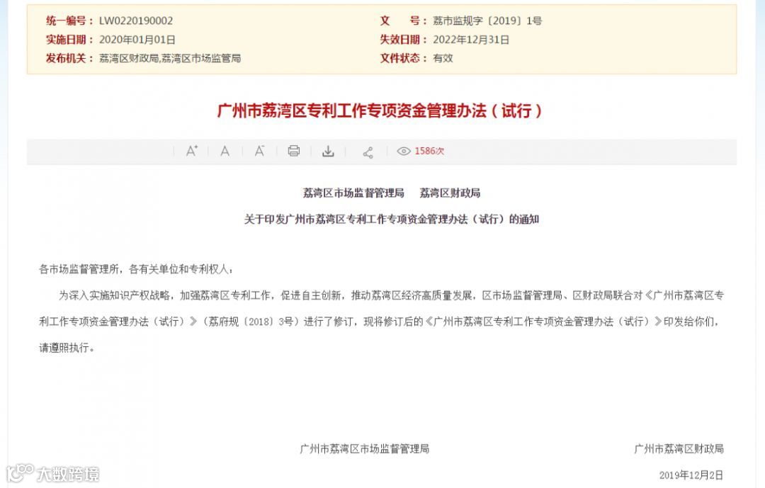 广州市荔湾区专利工作专项资金管理办法(试行)