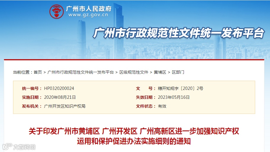 《广州市黄埔区 广州开发区 广州高新区进一步加强知识产权运用和保护促进办法实施细则》已经广州开发区知识产权局按程序审批同意,现印发执行。执行过程中如遇问题,请径向广州开发区知识产权局反映。