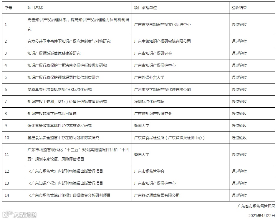 该批项目实施期限已满,根据《广东省知识产权局项目管理办法》(粤知〔2017〕32号)和项目合同要求,我局抽选专家组成项目验收专家组,对已完成的14个项目进行了验收评审。现将各项目验收结果公布如下: