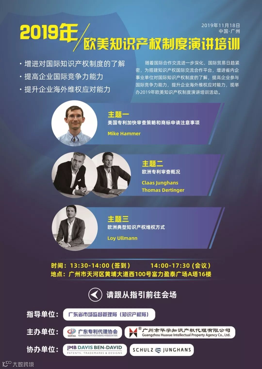 11月18日下午,由广东专利代理协会、广州市华学知识产权代理有限公司主办的“2019年欧美知识产权制度演讲培训”顺利在华学总部举行,这是华学乔迁至珠江新城新址办公以来,举办的第一场大型演讲培训会。