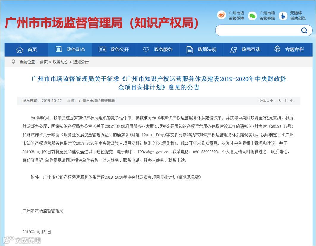 广州市市场监督管理局关于征求《广州市知识产权运营服务体系建设2019-2020年中央财政资金项目安排计划》意见的公告