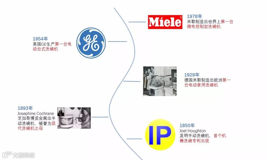 综上所述,洗碗机自1850年便已出现,从简单的手动水压冲洗、电动冲洗、微电脑控制型等技术的发展,到洗碗机外观、性能的不断改善,众多洗碗机品牌在激烈的竞争中,不断加大技术投入,并进行专利布局,占领市场。