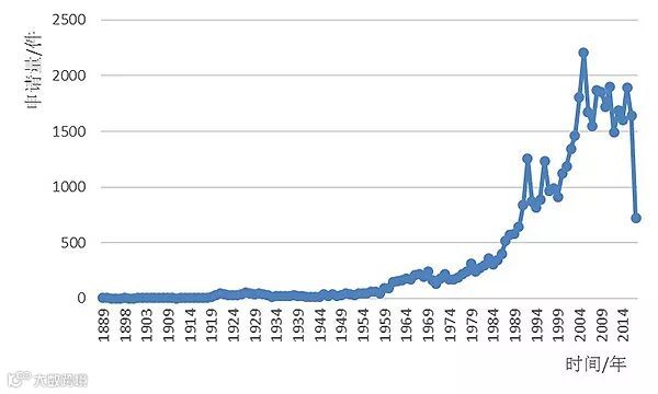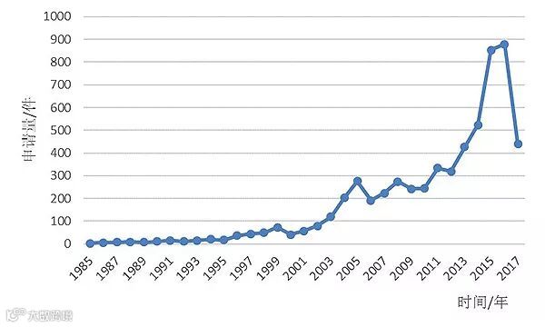 洗碗机进入中国较晚,中国企业在专利上的布局也晚于欧美国家近100年,中国在洗碗机上的专利布局开始于专利法实施之后。2000年以前,专利年申请量都较低,处于100件以下。到2000年以后专利申请呈现较快的增长,2005年专利申请量达到一个小高峰,之后稍有回落。2014年之后专利申请量呈现快速增长,也显示中国在洗碗机方面的关注度开始提升,并有更多的企业加入进来抢占中国市场。2016、2017年由于专利公开延后的原因,专利申请量有所下降。