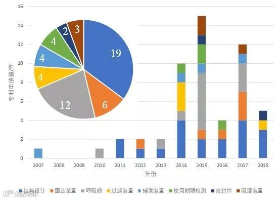 通过incopat数据库中检索,截止2020年2月9日,霍尼韦尔在中国地区申请的呼吸防护相关专利共计54件,包括25件发明、22件外观设计和7件实用新型专利。由图1所示,其最早的专利申请始于2007年,从2013年开始专利申请量大幅增长,于2015年达到峰值,此后专利申请量有所下降(由于按照常规程序,发明专利自申请后18个月才公开,因此2018年和2019年体现的数据较实际专利申请量偏低。)。