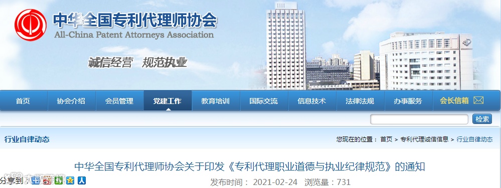 为完善行业自律工作机制,引导会员自觉遵守行业纪律,促进行业行稳致远,近日,中华全国专利代理师协会(以下简称协会)根据新修订的《专利代理条例》《专利代理管理办法》,协会《章程》,以及近年来专利代理行业发展中出现的新问题、新情况,适应性修改了《专利代理职业道德与执业纪律规范》,并经协会第十届七次常务理事会审议通过,现予印发,请认真贯彻执行。