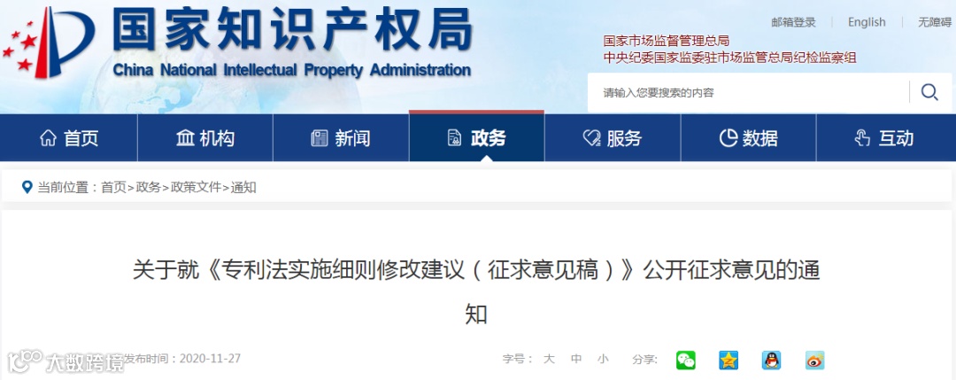 为配合专利法修改,国家知识产权局开展了专利法实施细则修改准备工作,形成了专利法实施细则修改建议,现将《专利法实施细则修改建议(征求意见稿)》(以下简称“征求意见稿”)及其说明予以公布,征求社会各界意见。有关单位和各界人士可以在2021年1月11日前,选择以下方式中的一种,围绕征求意见稿的修改完善提出具体意见:
