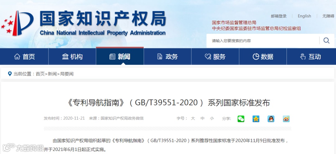 由国家知识产权局组织起草的《专利导航指南》(GB/T39551-2020)系列推荐性国家标准于2020年11月9日批准发布,并于2021年6月1日起正式实施。