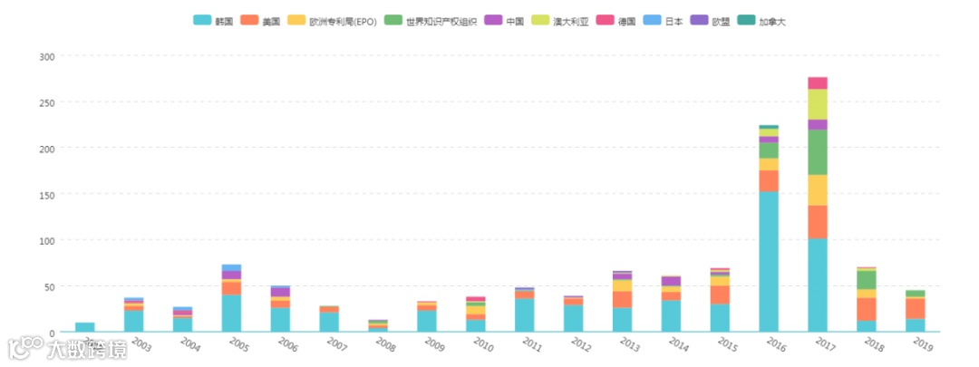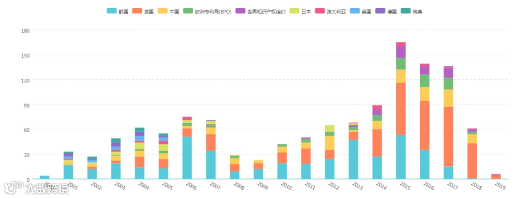 图5数据显示,LG在韩国布局的专利数量最多。其次是美国、欧洲专利局和世界知识产权组织。其中直接在中国和澳大利亚也布局了部分专利。与三星的布局策略相同的地方在于其在日本布局的专利申请相对较少。