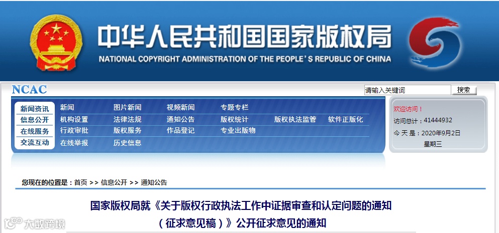 为进一步加大版权保护力度,根据有关工作安排,国家版权局就《关于版权行政执法工作中证据审查和认定问题的通知(征求意见稿)》向社会公开征求意见。请相关单位或个人于2020年9月30日前通过信件或者电子邮件方式以中文提出修改意见。