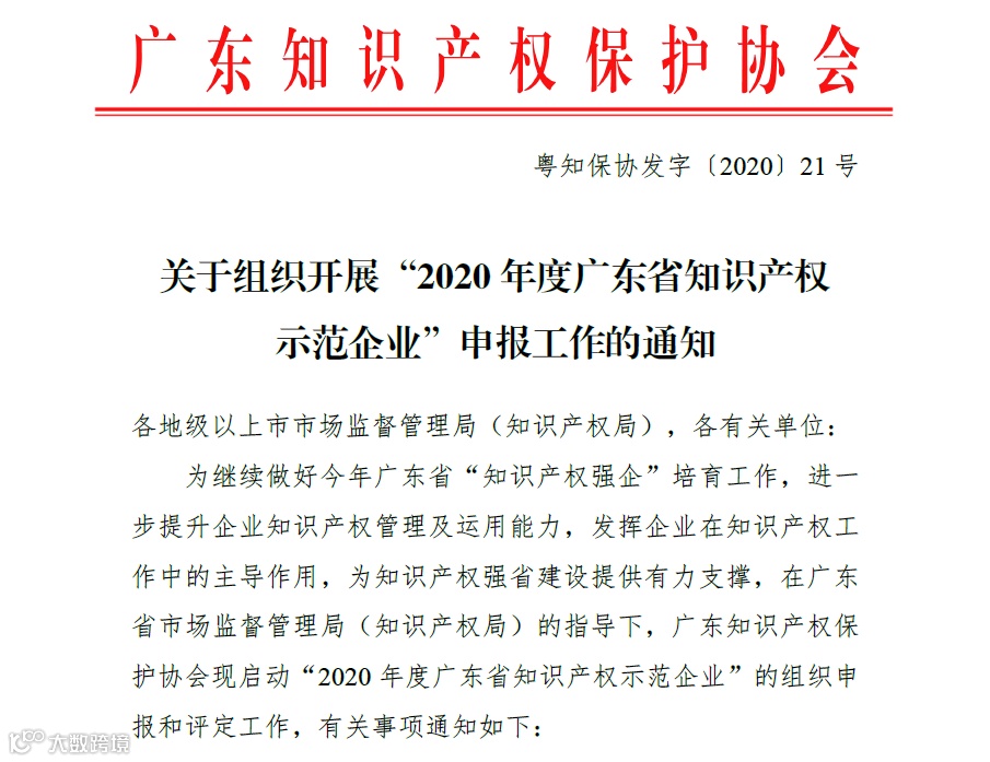 2020年4月21日,广东知识产权保护协会发布了《关于组织开展“2020年度广东省知识产权示范企业”申报工作的通知》,2020年度知识产权示范企业申报工作正式启动!