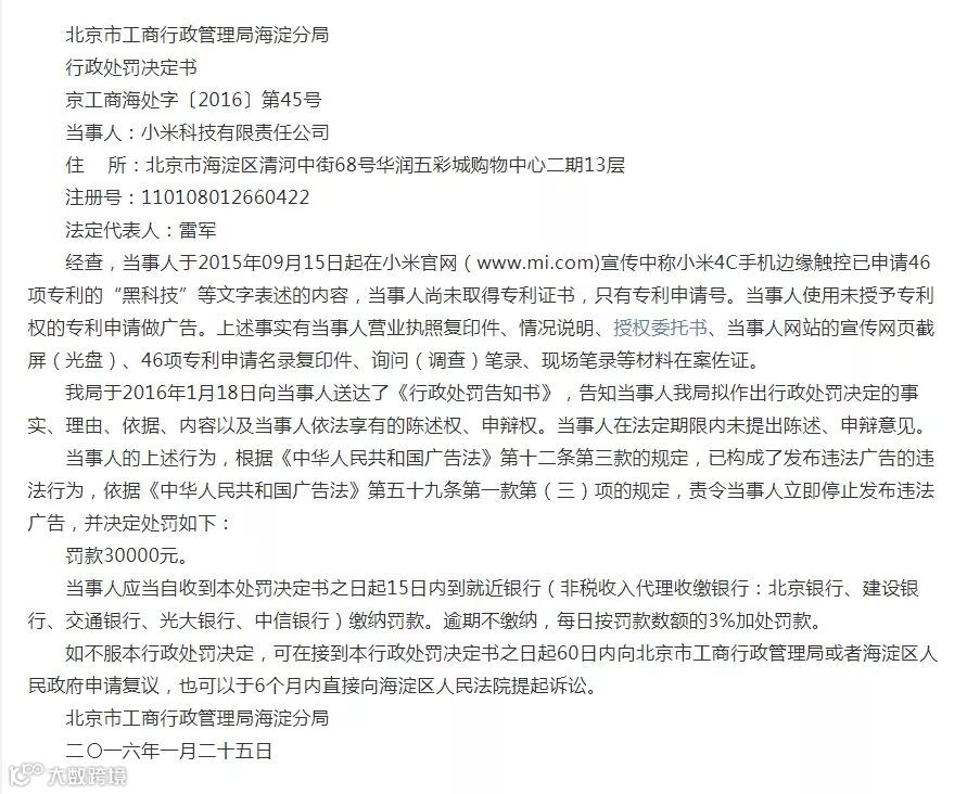 该公司于2015年9月在小米官方网站中称小米4C手机边缘触控已申请46项专利的“黑科技”,但其仅进行专利申请而尚未获得专利证书,北京市工商行政管理部门因其使用未授予专利权的专利申请进行宣传,责令其停止发布广告,并处3万元的罚款。