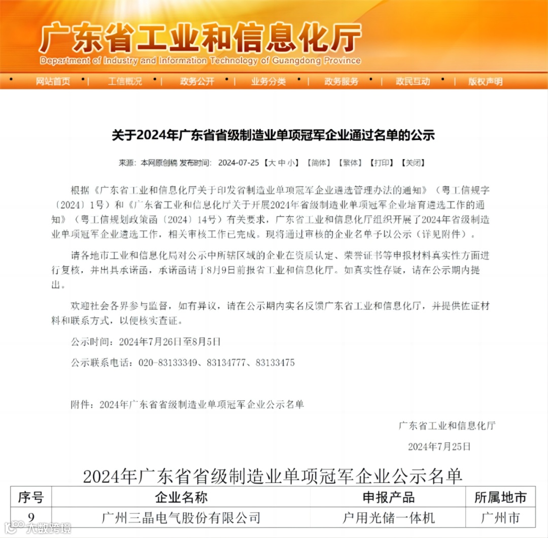 三晶电气荣获“广东省制造业单项冠军企业”称号!