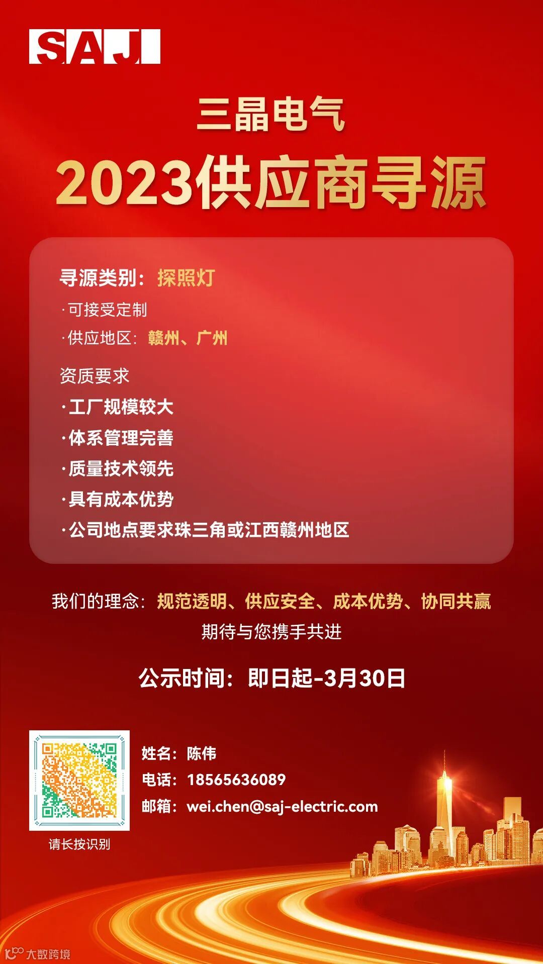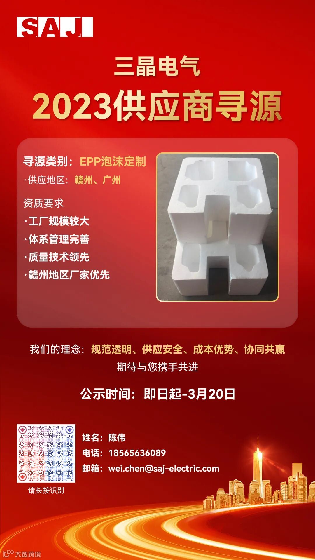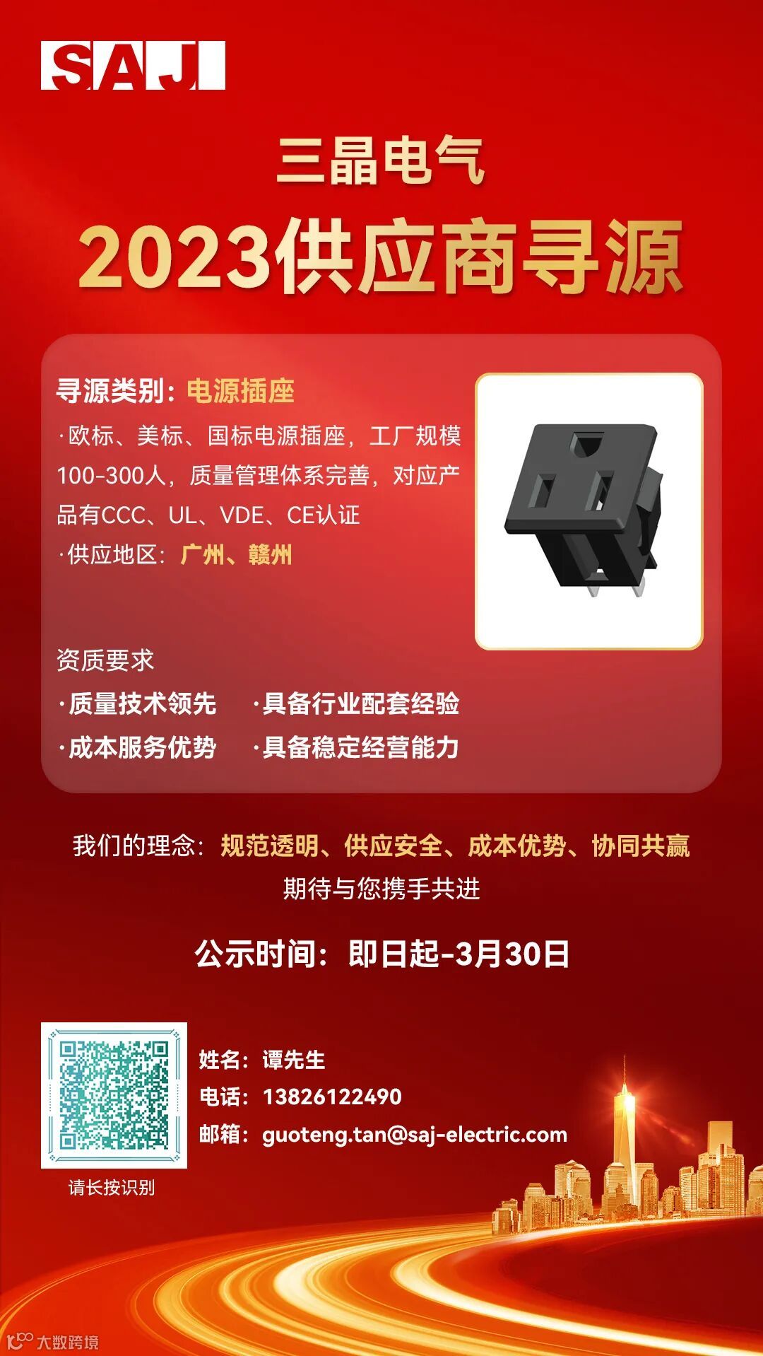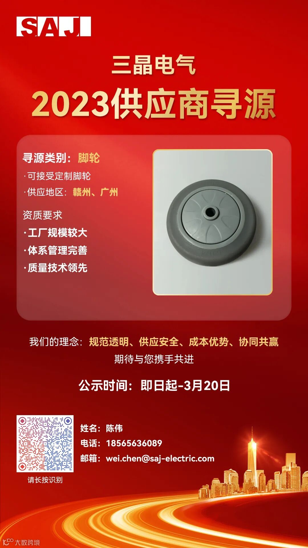 三晶拟对2023年“线束加工”、“插座电源”、“探照灯”、“脚轮”、“EPP泡沫定制”等项目公开招募供应商,欢迎所有满足资质要求的供应商积极参与。