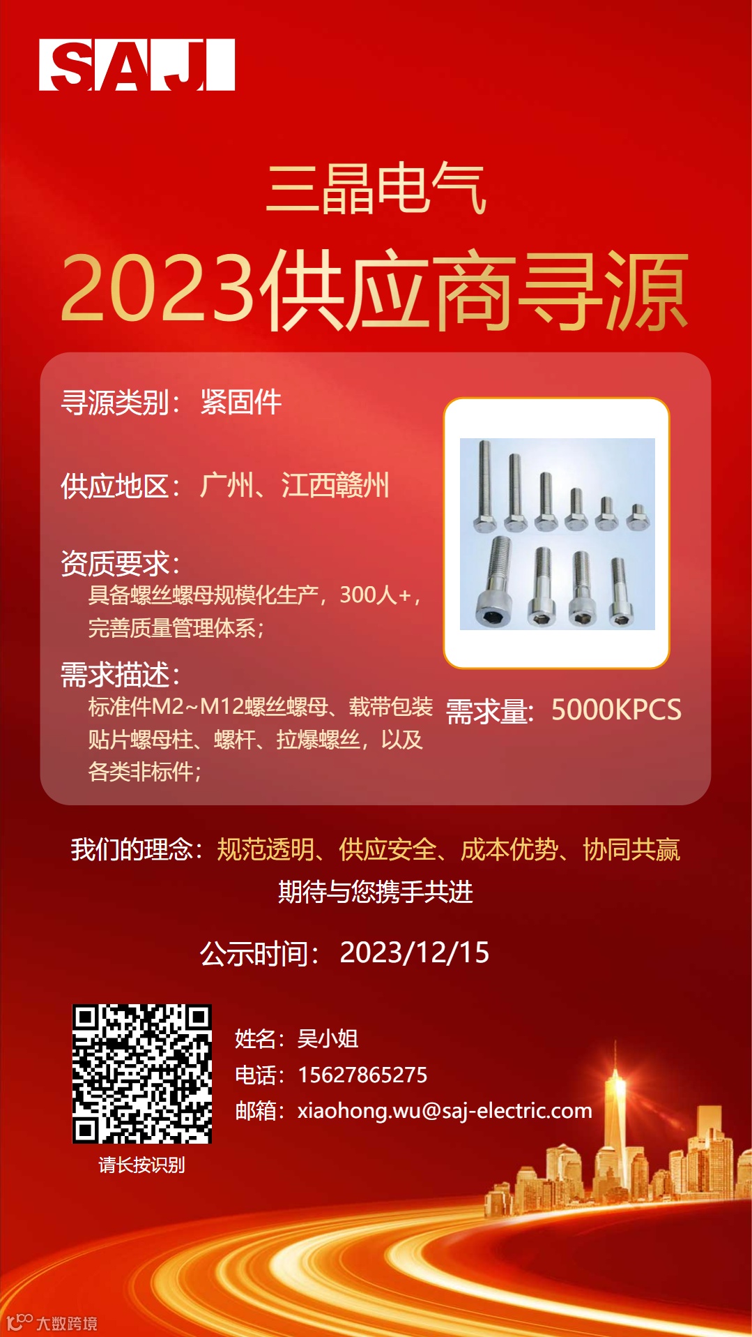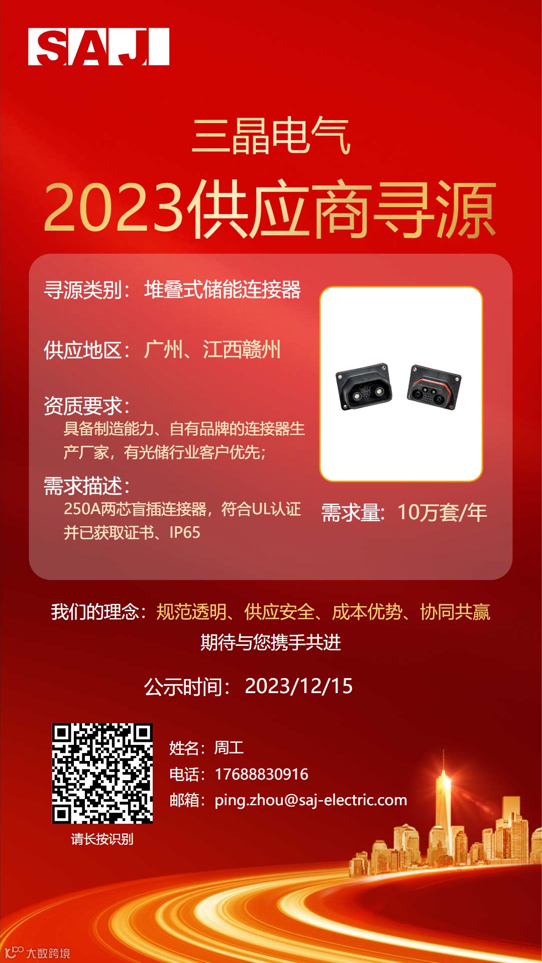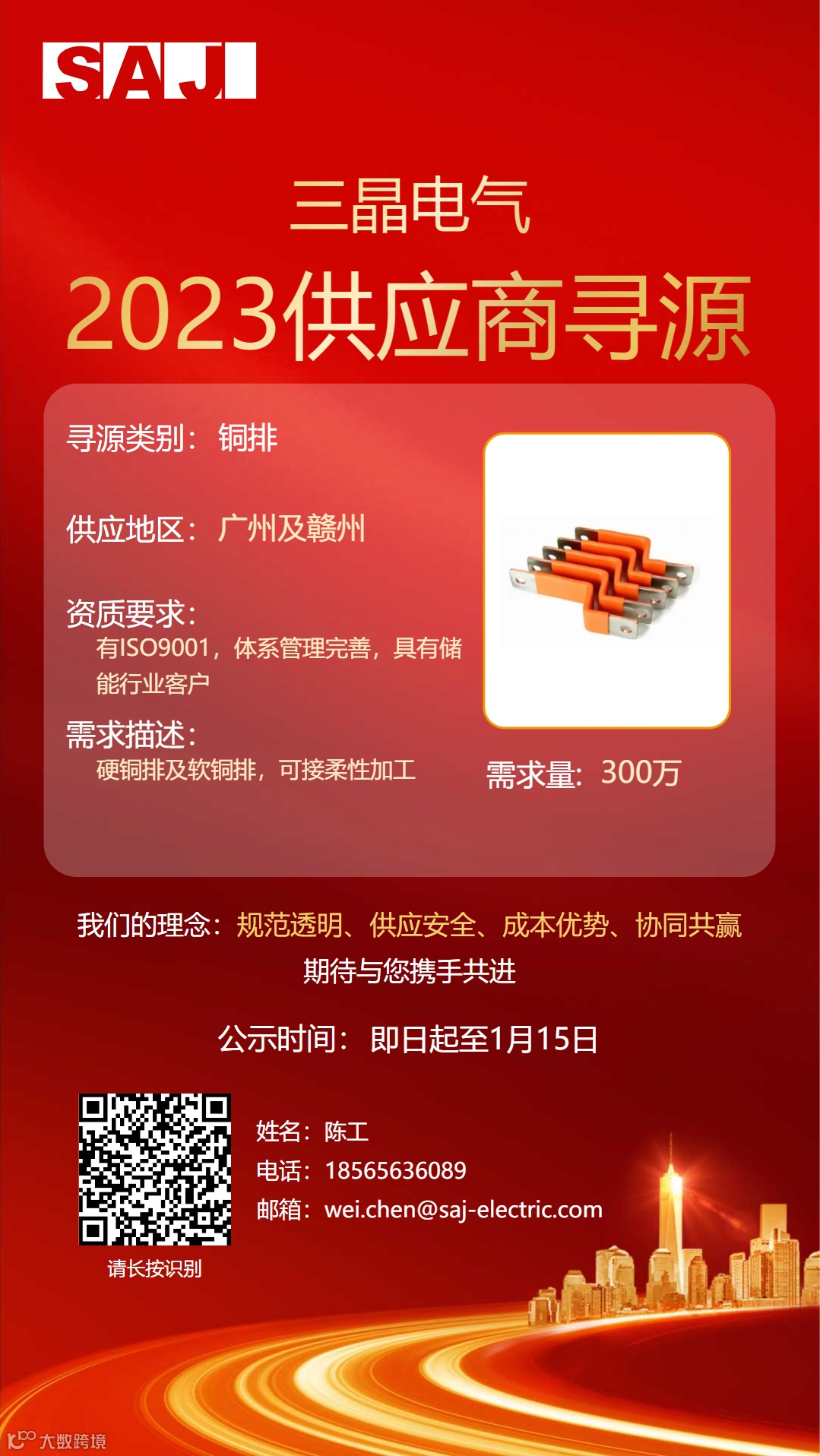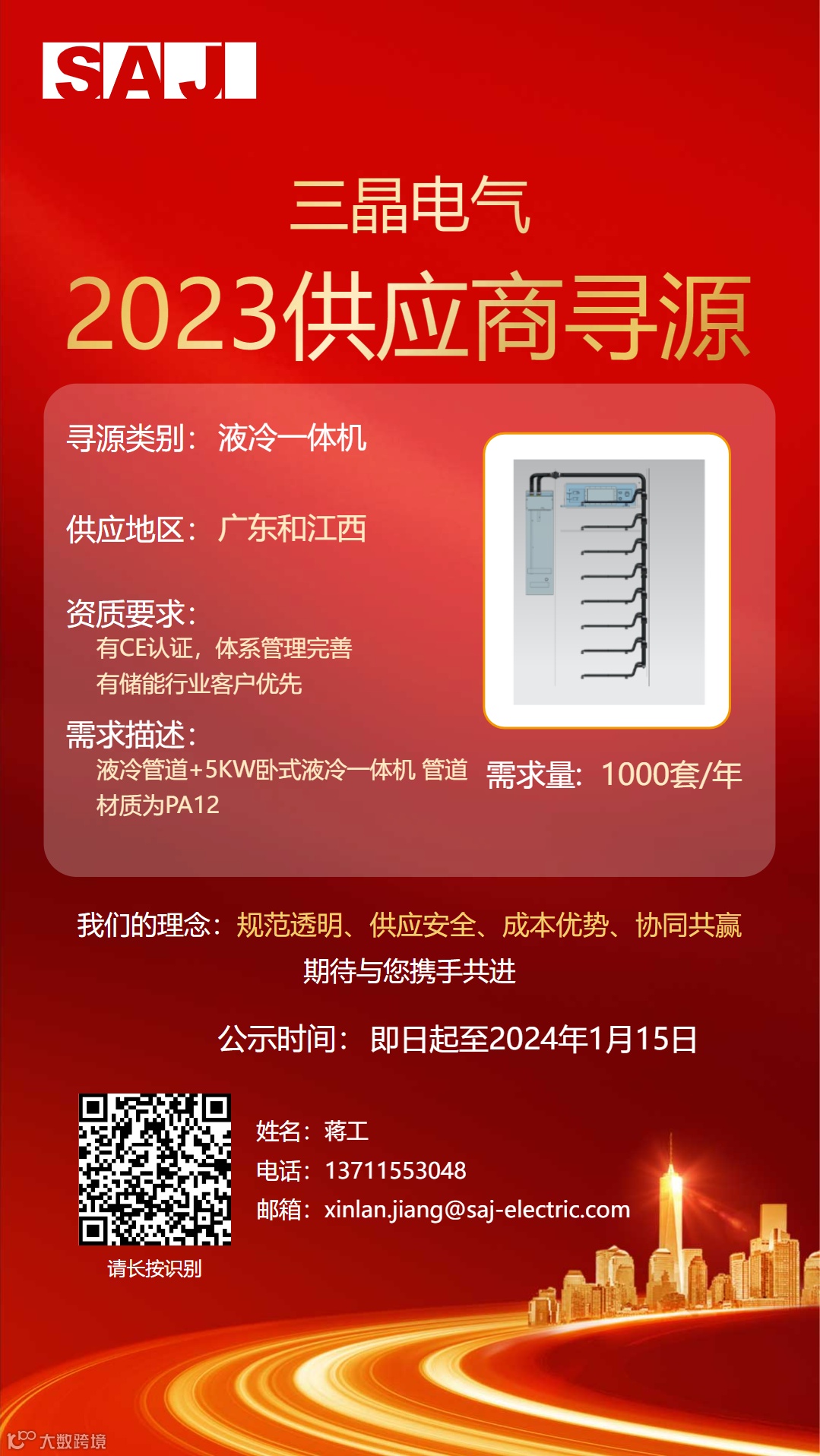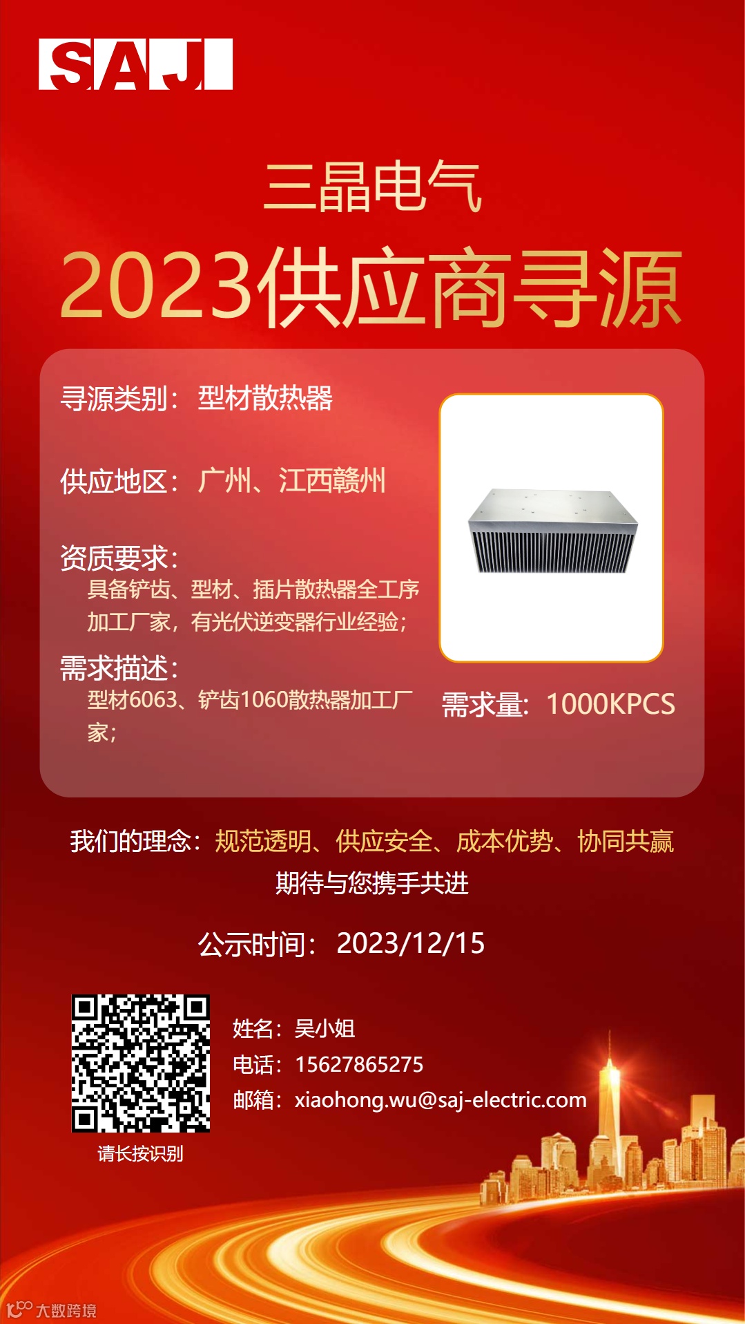 三晶拟对2023年“型材散热器、堆叠式储能连接器、紧固件、液冷一体机和铜排”公开招募供应商,欢迎所有满足资质要求的供应商积极参与。