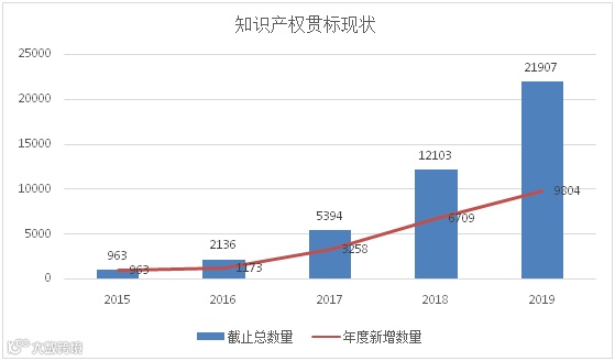 如下图所示,我们就知识产权贯标现状展开分析,截止至2019年7月底,全国通过知识产权贯标的企业数量达到21907家,与2015年的963家相比,翻了21倍;尤其是近两年获证企业的数量增速快,这得益于国家的各级相关单位在政策上面给予了大力支持。比如,2015年9月,广东省人民政府印发《广东省深入实施知识产权战略推动创新驱动发展行动计划》,明确要求推广运用《企业知识产权管理规范》,引导高新技术企业、大型骨干企业及国有企业等提升知识产权管理水平。在省层面的推动下,广州、深圳、佛山、中山、东莞、惠州、珠海、湛江等市先后贯标扶持配套政策,有力推动全省贯标工作健康发展。