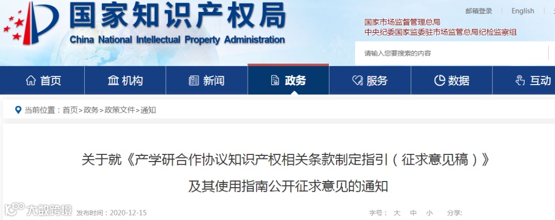 为深入贯彻《中共中央 国务院关于新时代加快完善社会主义市场经济体制的意见》《中共中央 国务院关于构建更加完善的要素市场化配置体制机制的意见》有关决策部署,基于产学研合作中知识产权处置的不同情况,进一步规范和指导协议相关知识产权条款的制定,国家知识产权局起草了《产学研合作协议知识产权相关条款制定指引(征求意见稿)》及其使用指南(以下简称“征求意见稿”)。现就该征求意见稿向社会公开征求意见,有关单位和各界人士可于2020年12月31日前,选择以下方式的一种,围绕征求意见稿的修改完善提出具体意见: