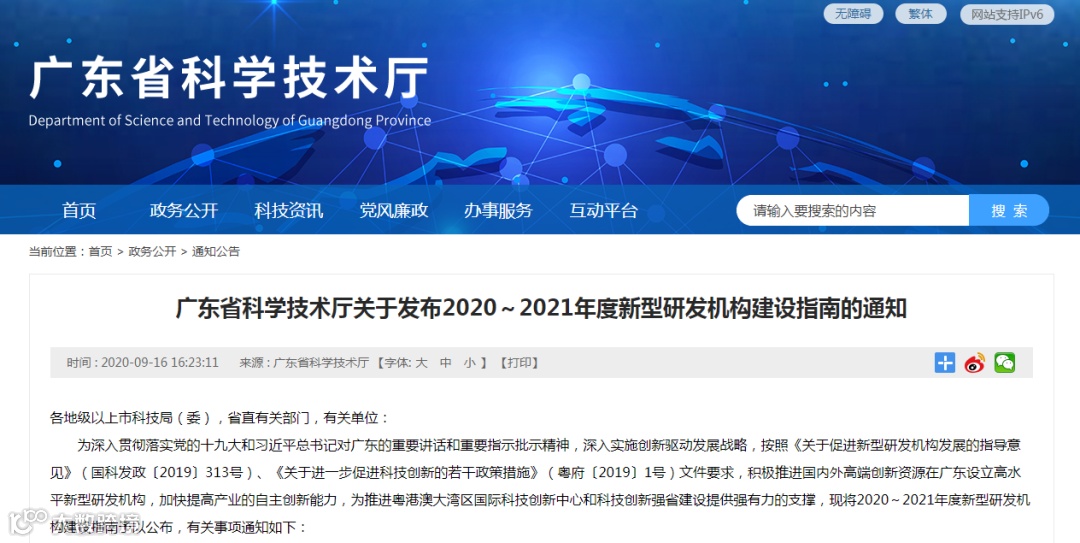 1.广东省科学技术厅关于发布2020~2021年度新型研发机构建设指南的通知