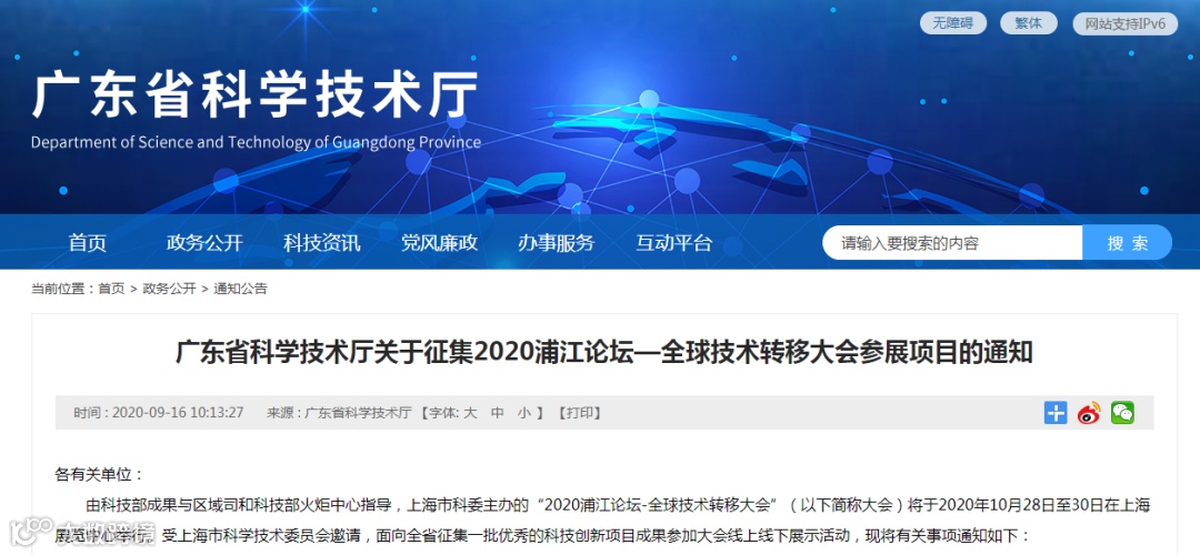 2.广东省科学技术厅关于征集2020浦江论坛—全球技术转移大会参展项目的通知