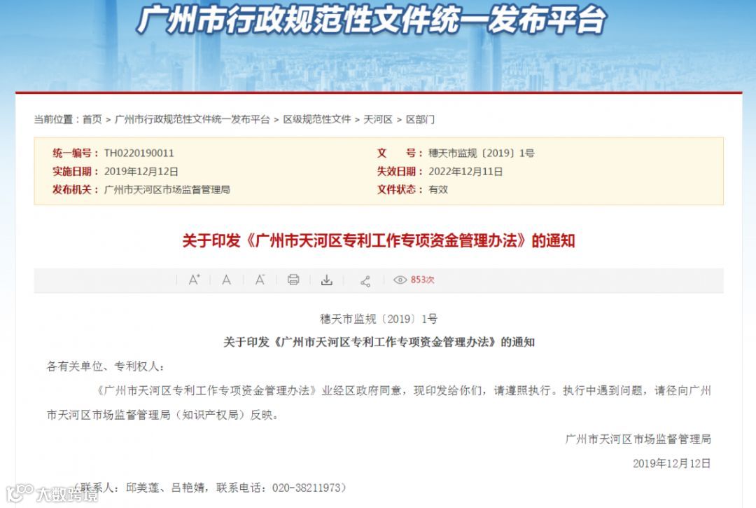 区市场监督管理局(知识产权局)负责在天河区门户网站公开专项资金管理办法、申报指南、申报情况、分配程序和方式、分配结果、绩效评价、监督检查、审计、投诉处理等相关信息,接受社会和群众的监督。