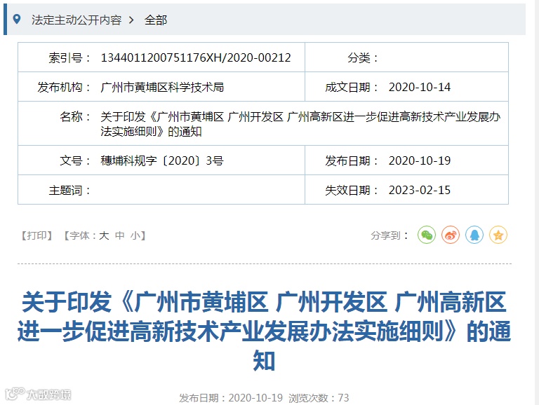 关于印发《广州市黄埔区 广州开发区 广州高新区进一步促进高新技术产业发展办法实施细则》的通知
