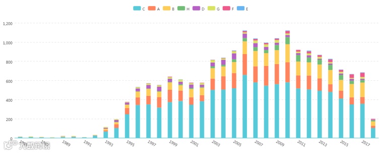 图3的数据显示,巴斯夫的专利申请涉及到各个技术领域,主要集中在其主营业务化学材料的这一领域。早期巴斯夫在中国的专利申请相对较少,在1996年巴斯夫在中国的年度申请突破500件。目前,巴斯夫在中国每年保持着稳定的专利申请,体现出巴斯夫重视中国市场。