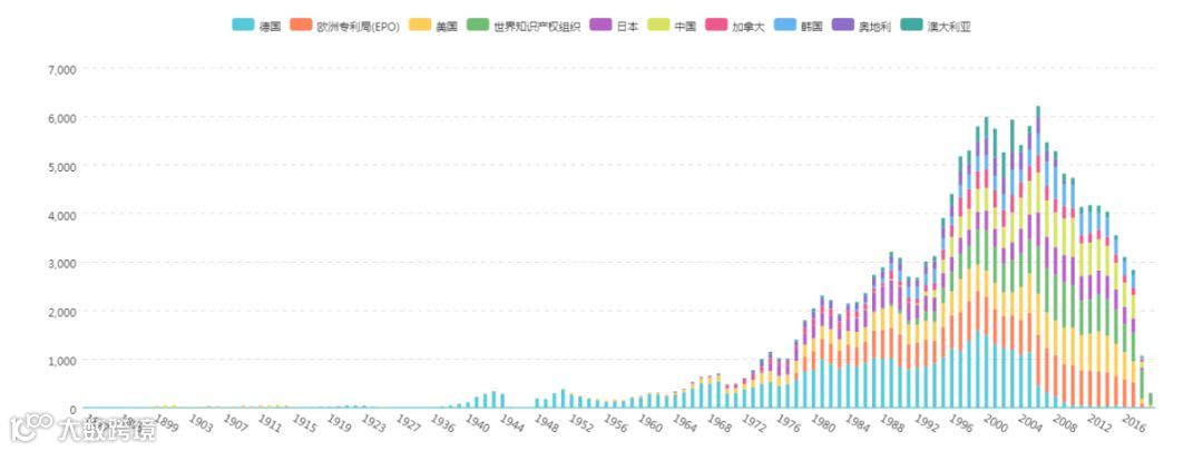 图1和表1的数据显示,巴斯夫的专利地域布局十分广阔,其申请的专利主要在德国、欧洲专利局、美国、世界知识产权组织、日本和中国等国家和地域公开。
