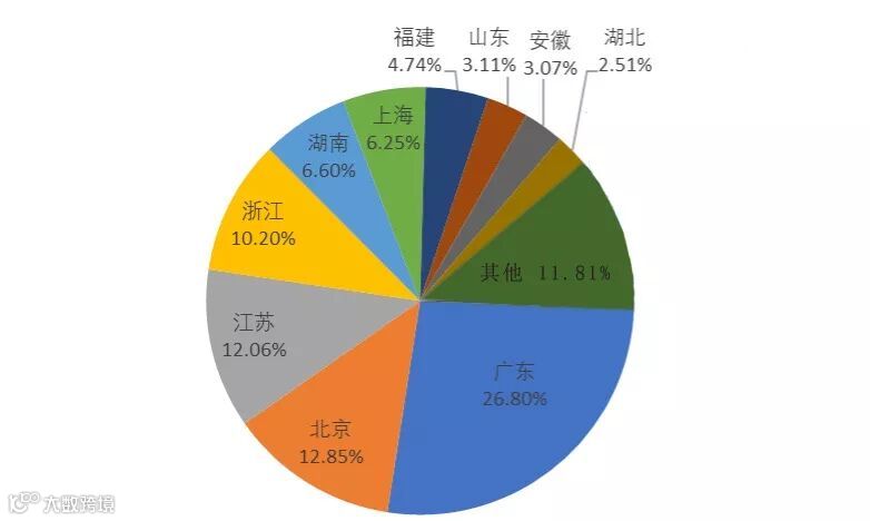 3、广东、北京、江苏、浙江、湖南、上海和福建等经济较发达地区的专利申请量较大