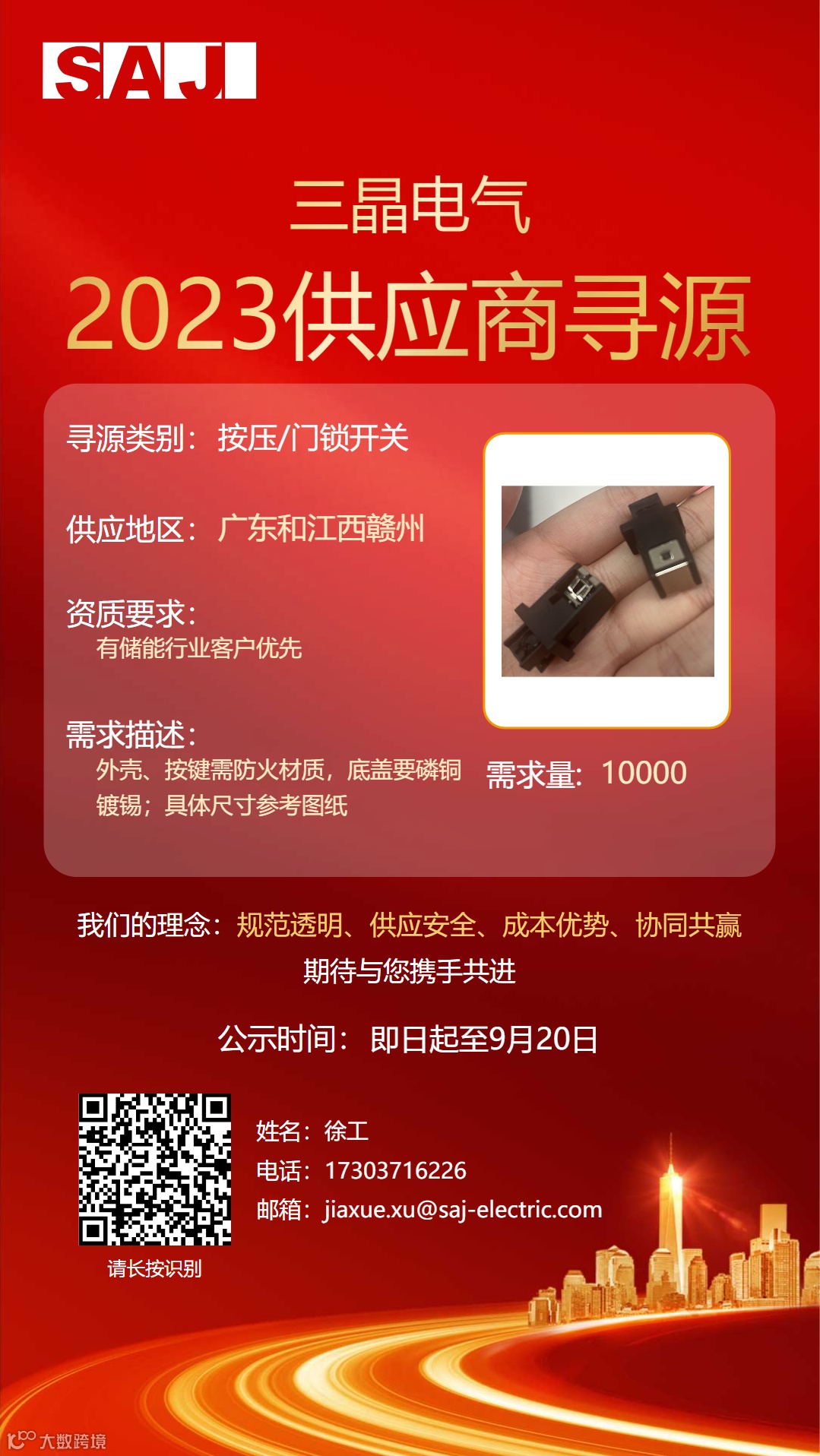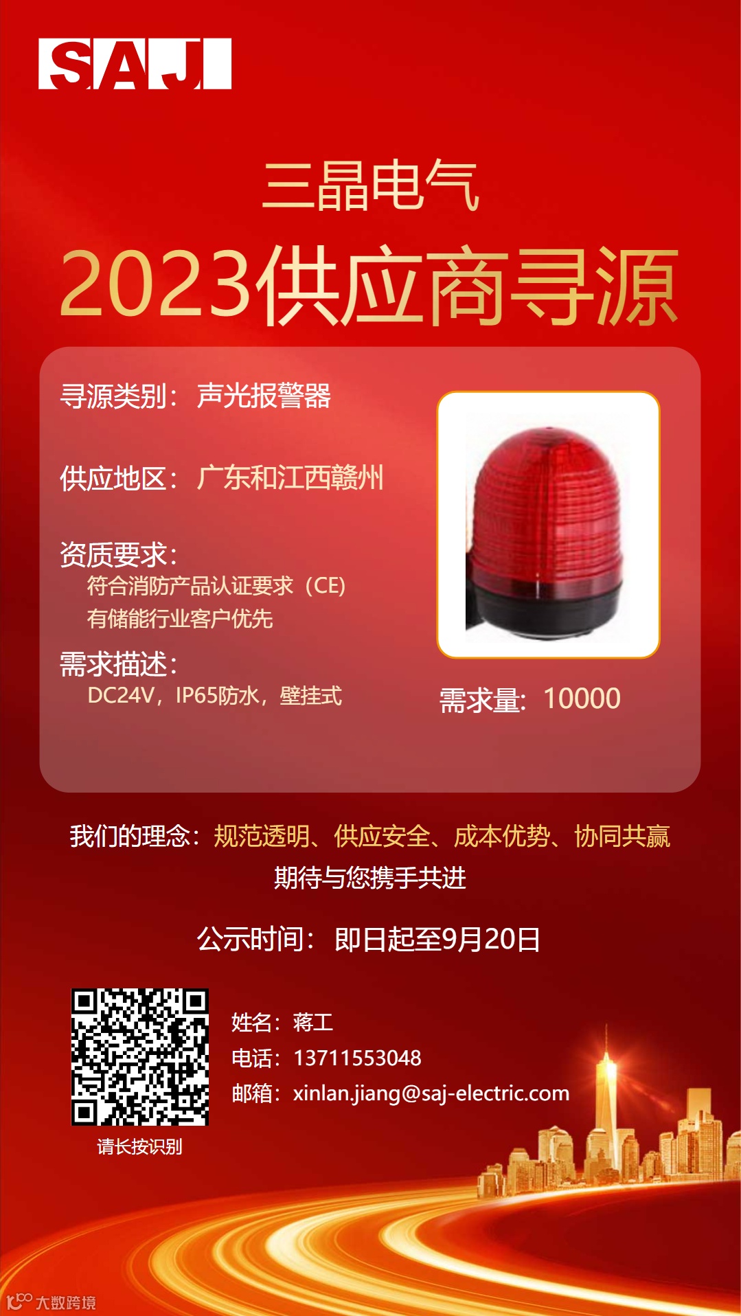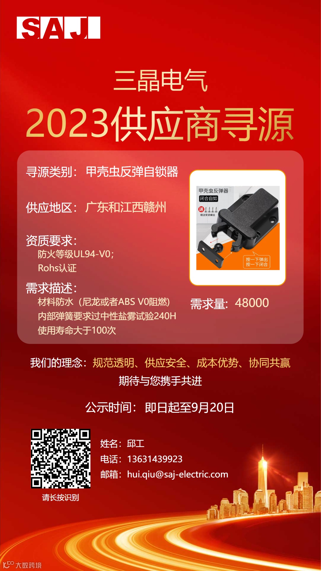 三晶拟对2023年“声光报警器、甲壳虫反弹自锁器、按压/门锁开关”公开招募供应商,欢迎所有满足资质要求的供应商积极参与。