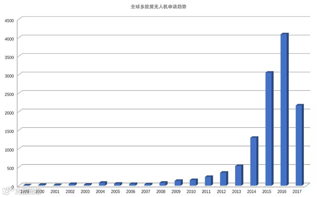 从上图显示的数据可知,近几年多旋翼无人机的申请量增长急速加快。从2002年到2009年,多旋翼无人机领域的专利申请量总体上呈现平稳趋势,从2009年至2013年呈缓慢增长趋势。从2014年至2016年,增长曲线变得非常陡峭,增长加快,这反映出多旋翼无人机的需求在急速增长。2016年,全球的多旋翼无人机申请量突破4000件。