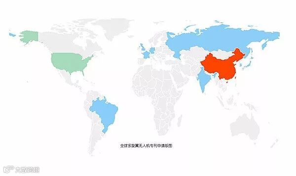 上图展示了全球专利申请中,多旋翼无人机相关专利的专利申请版图,在该版图中,颜色由蓝至红的变化代表了这个国家或地区的专利申请数量逐渐递增。中国是多旋翼无人机专利申请数量最多的国家,这也与目前市场上多旋翼无人机的占有情况相符。美国位于第二,接下来依次是韩国、日本、欧洲、德国、法国以及俄罗斯,其它国家的相关专利申请数量较少。