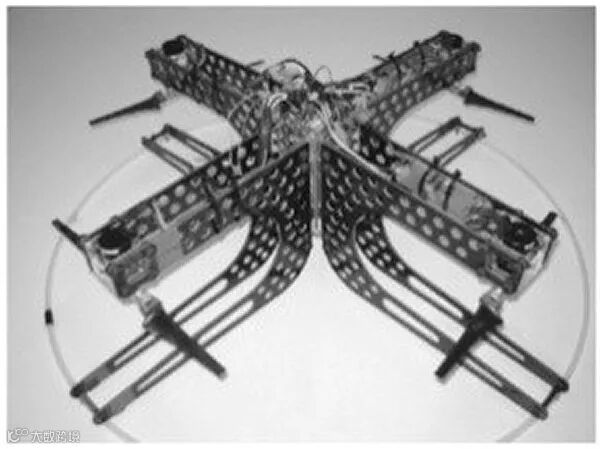2005年,宾夕法尼亚大学研究团队,将算法应用至两个摄像机上,通过摄像机提供的视觉反馈对四旋翼飞行器进行了控制。瑞士联邦科技学院的Bouabdallah研究团队将两种非线性的控制方法——反步控制和滑膜变结构控制应用在OS4平台,使飞行器具有较强的抗干扰能力,下图为其团队的四旋翼飞行器OS4实验平台。