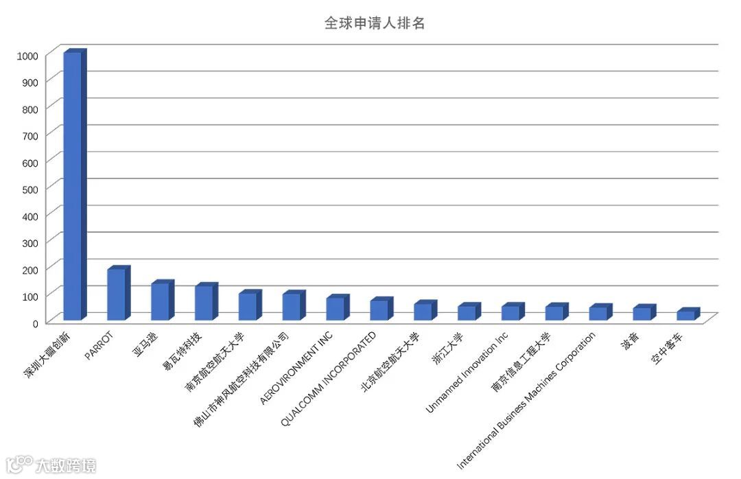上述的全球申请人排名中,显示了多旋翼无人机相关专利申请数量排名前15位的申请人,排在首位的是深圳市大疆创新科技有限公司,其多旋翼无人机的专利申请数量远超于第二位的PARROT,足以可见大疆创新公司在多旋翼无人机领域的专利布局情况,位于第三、第四位的分别是亚马逊及易瓦特科技股份公司。位于前15的有多个我国高校,这足以看出我国高校在多旋翼无人机领域的发展情况。纵观上述申请人排名即可知,我国在全球多旋翼无人机领域中的地位。